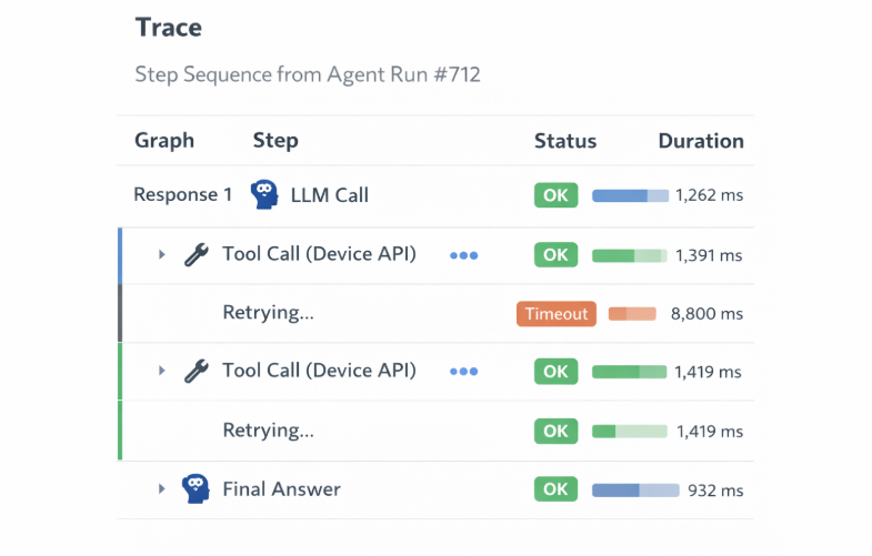 Log traces of every tool call, simulate tool failures, and score both the final outcome and the intermediate steps (tool choice, parameters, retries). Trace-level grading helps pinpoint workflow errors.