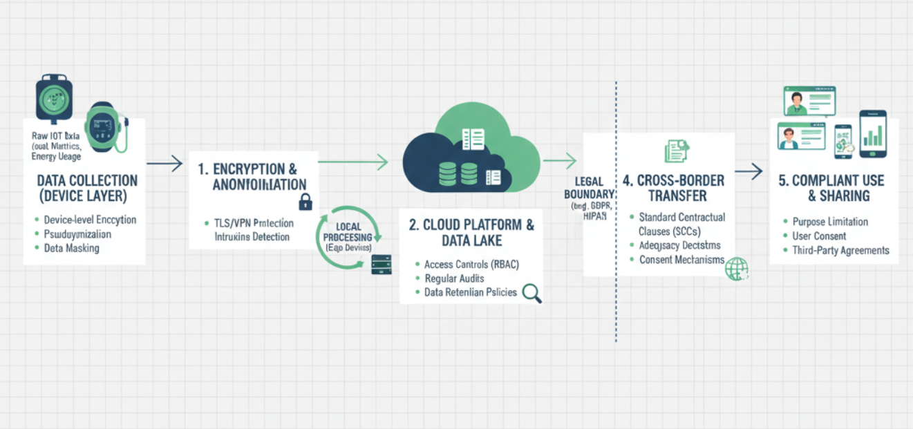 It’s the practice of building and operating IoT systems in accordance with data privacy and cybersecurity regulations, including encryption, consent, access control, risk management, and reporting.