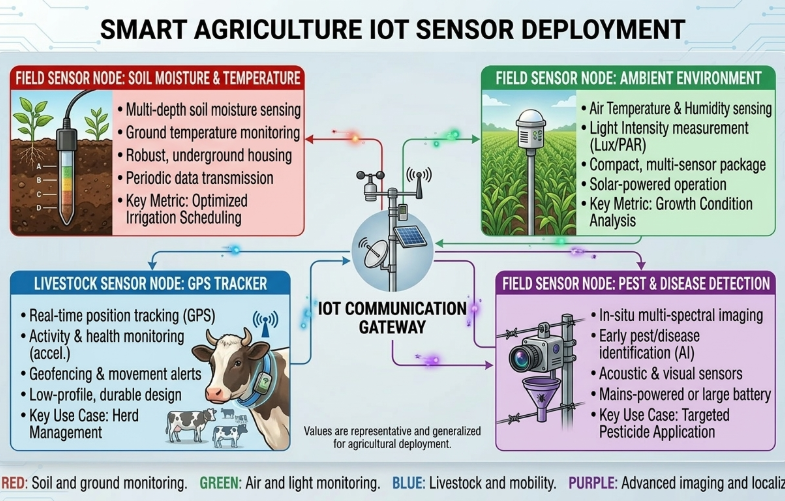 Consider an agricultural monitoring system that uses wireless sensors to track soil moisture, temperature, and humidity across a large farming area.
